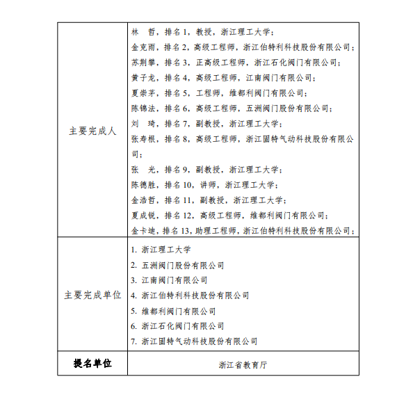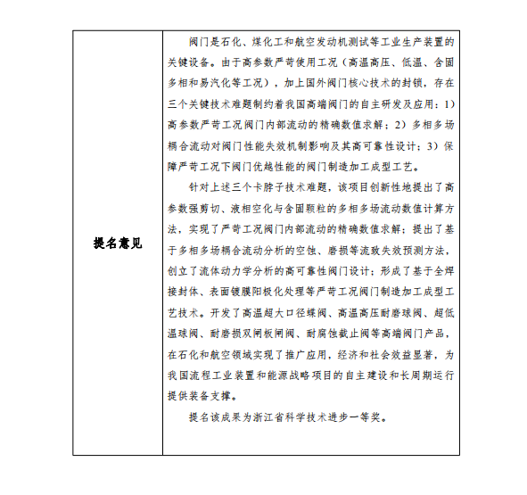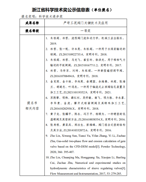 根據(jù)《浙江省科學(xué)技術(shù)廳關(guān)于開(kāi)展2021年度浙江省科學(xué)技術(shù)獎(jiǎng)提名工作的通知》要求,現(xiàn)對(duì)我單位擬參與申報(bào)的浙江省科技獎(jiǎng)勵(lì)項(xiàng)目“嚴(yán)苛工況閥門(mén)關(guān)鍵技術(shù)及應(yīng)用”予以公示,公示期7天(2022年2月26日至2022年3月4日)。